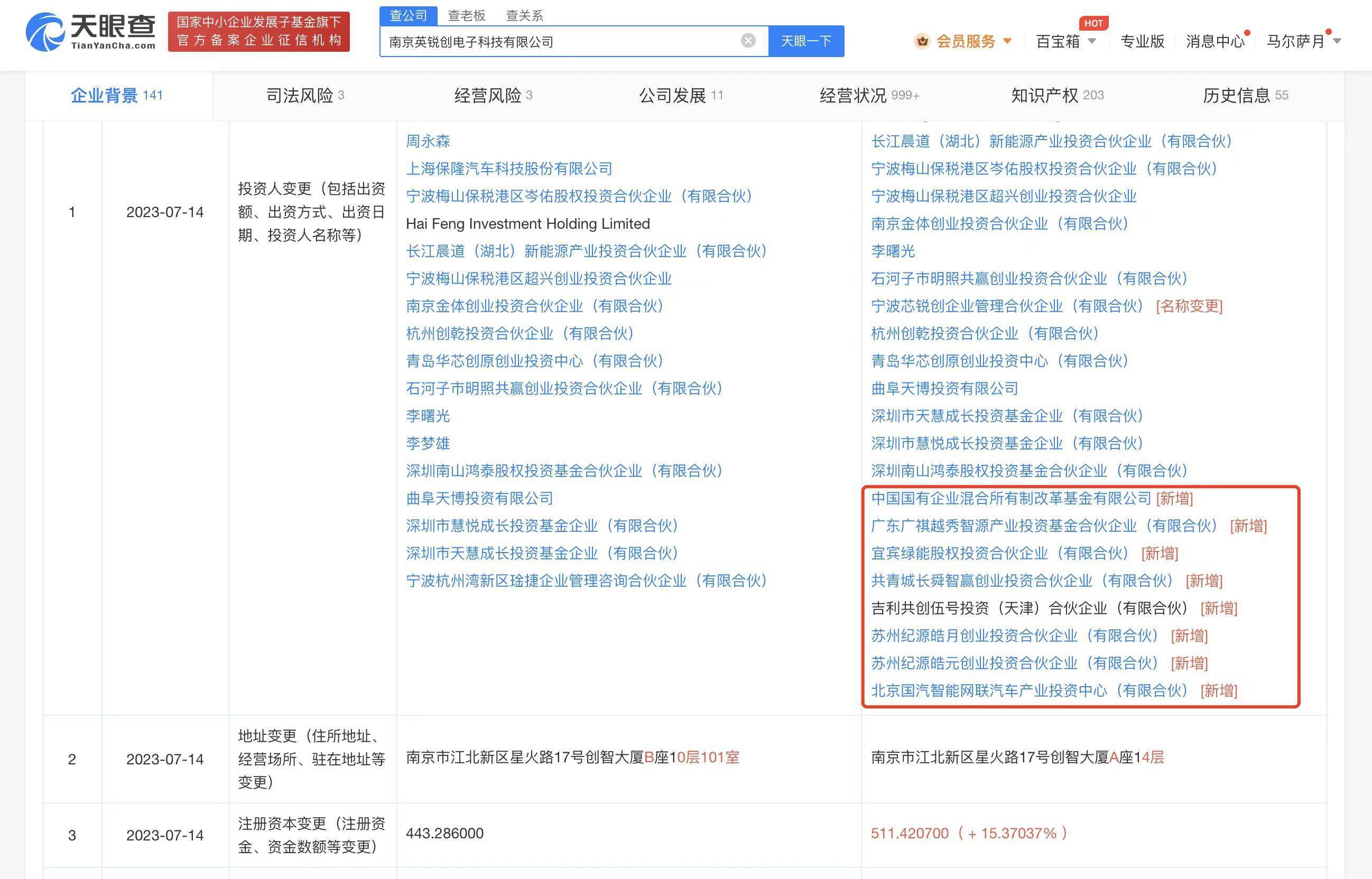 天眼查App显示,近日,琻捷电子关联公司南京英锐创电子科技有限公司发生工商变更,股东新增中国国有企业混合所有制改革基金有限公司、广汽旗下广东广祺越秀智源产业投资基金合伙企业(有限合伙)、吉利旗下吉利共创伍号投资(天津)合伙企业(有限合伙)等多家企业。同时,该公司注册资本由约443.29万人民币增至约511.42万人民币,增幅约15.37%。