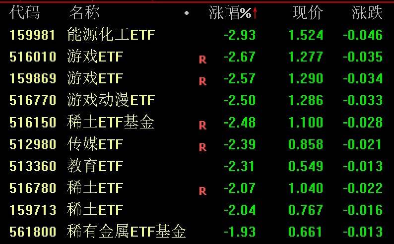 下跌方面,能源化工ETF跌近3%,游戏、稀土等相关ETF跌超2%。