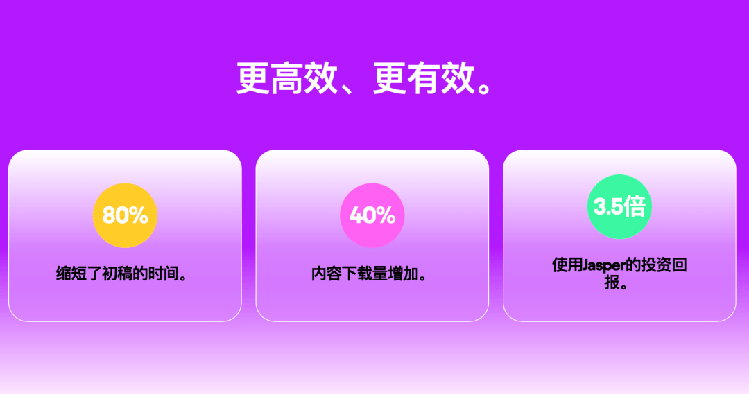伴随迭代升级,这款工具最终被命名为Jasper.AI,可提供60多个适合各种用例的文案模板,支持超过25种语言,面向包括企业、媒体人、营销人员、博主、代理商和自由职业者等在内的用户,企业、团队和个人能够灵活选用适合的套餐模式。