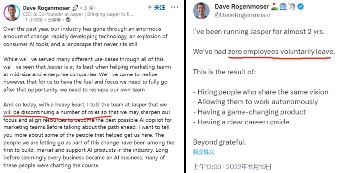 图左,2023年7月,Jasper开启裁员。图右,2022年11月,Jasper员工0离职