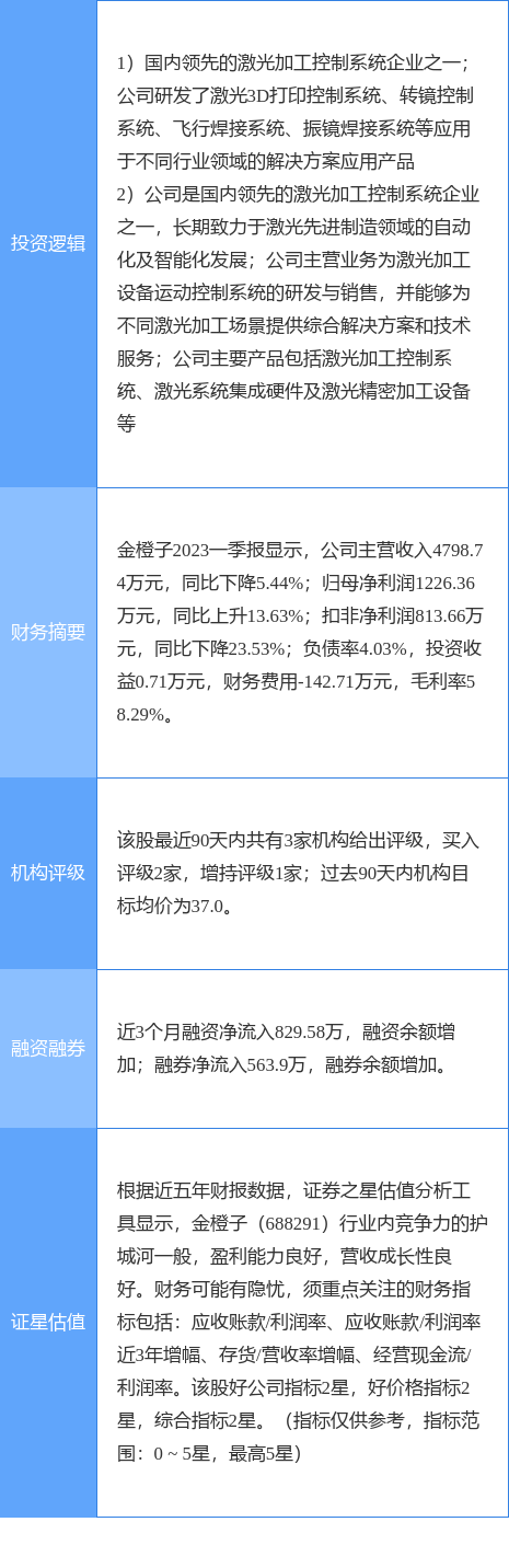 金橙子涨停收盘,收盘价41.05元。该股于9点38分涨停,1次打开涨停,截止收盘封单资金为292.07万元,占其流通市值0.29%。