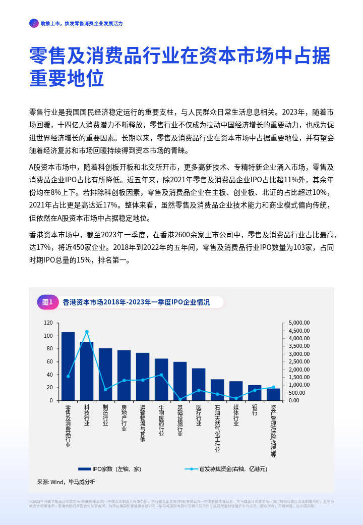 2023年以来,政府推出一系列政策和措施促进经济健康运行、激发企业发展活力。在此大环境下,零售消费企业纷纷抓稳发展机遇,进行变革求生。其中走向资本市场是零售消费企业获得稳定的融资渠道、提升品牌价值和市场影响力、增强企业自身竞争优势的重要途径。数据统计来看,零售及消费品行业依然在资本市场占据重要位置,其中在香港市场,依然保持着IPO数量第一的成绩,可见资本市场对零售及消费品企业敞开怀抱。