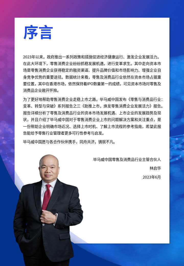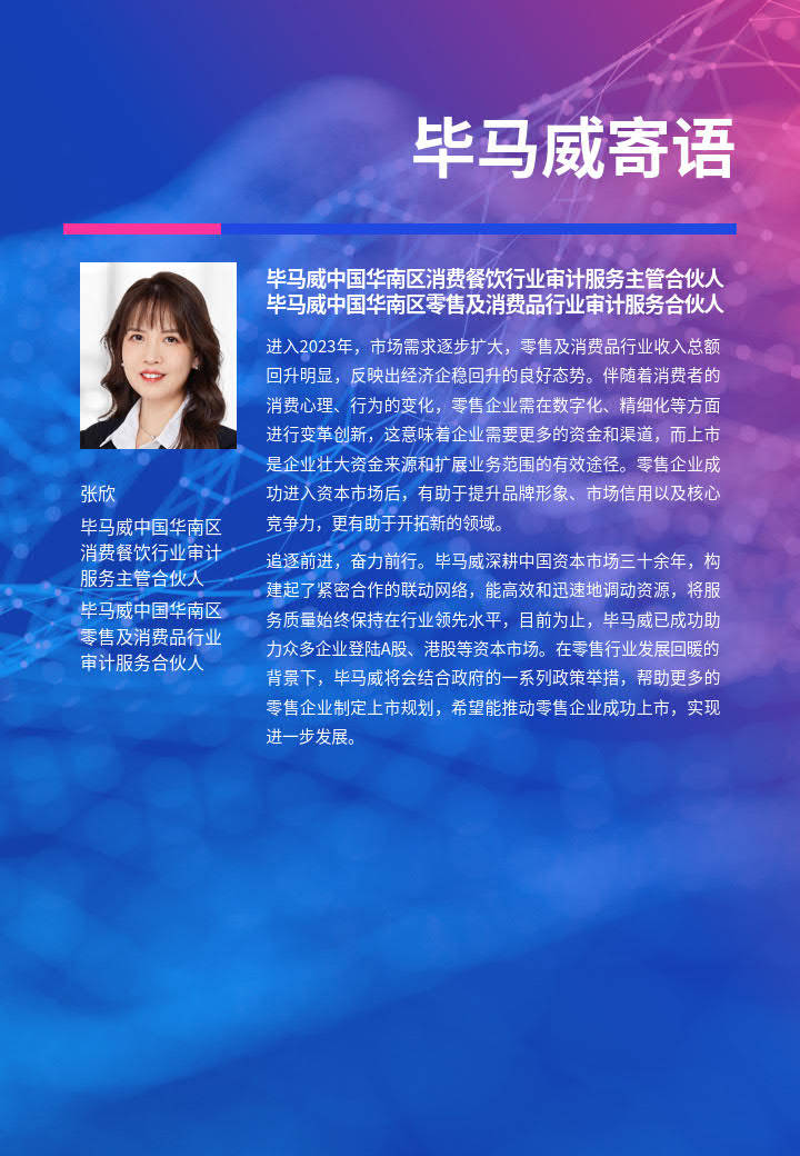 为了更好地帮助零售消费企业走稳上市之路,毕马威中国发布《零售与消费品行业变革、转型与突破》系列报告之三《助推上市,焕发零售消费企业发展活力》报告报告详细分析了零售及消费品行业的资本市场发展机遇、上市企业的发展趋势及现状,并且介绍了毕马威中国对于零售消费企业上市的问题解决方案和关注重点,是一份帮助企业明确市场近况、选择上市时机、了解上市流程的参考指南,希望此报告能给予零售行业管理者更多可行性参考与启发。