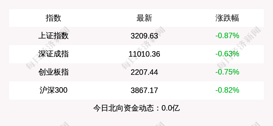 北京时间7月17日15:00,上证指数收盘下跌28.07点,跌幅为0.87%,报收3209.63点,成交额3220.74亿元;深证成指收盘下跌69.96点,跌幅为0.63%,报收11010.36点,成交额4805.02亿元;创业板指收盘下跌16.66点,跌幅为0.75%,报收2207.44点,成交额2185.22亿元;沪深300收盘下跌31.93点,跌幅为0.82%,报收3867.17点,成交额1746.24亿元。