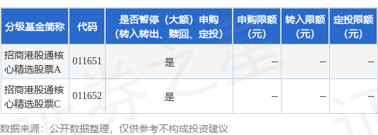 7月17日招商基金管理有限公司发布《关于暂停招商港股通核心精选股票型证券投资基金申购(含定期定额投资)和赎回业务的公告》。公告中提示,为保障基金的平稳运作,维护基金份额持有人利益,自2023年7月17日起暂停招商港股通核心精选股票型证券投资基金申购(含定期定额投资)和赎回业务,下属分级基金调整明细如下: