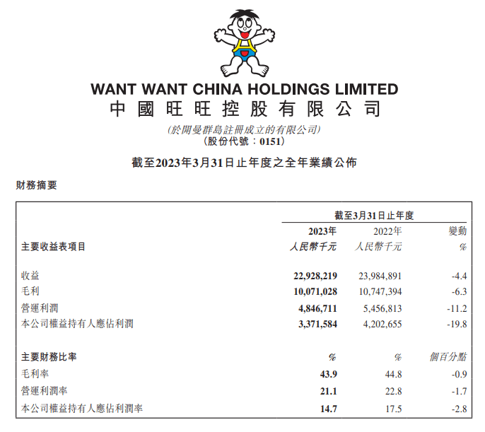日前,旺旺(00151.HK)发布2022年全年业绩。业绩显示,公司全年实现营收229.28亿元,与上年同期的239.8亿元相比微降4.41%;实现归母净利润33.72亿元,比上年的42亿元同比大幅下降19.77%。