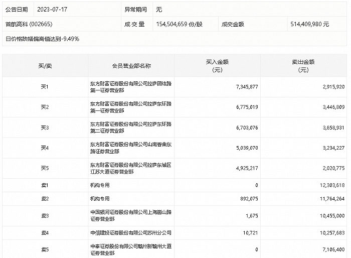 7月17日,首航高科今日跌停,龙虎榜数据显示,上榜营业部席位全天成交9885.64万元,占当日总成交金额比例为19.22%。其中,买入金额为3169.27万元,卖出金额为6716.36万元,合计净卖出3547.09万元。