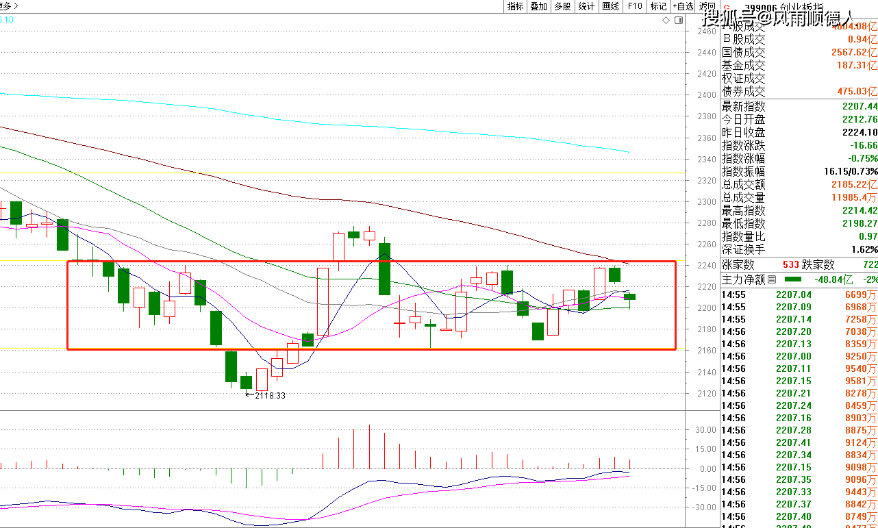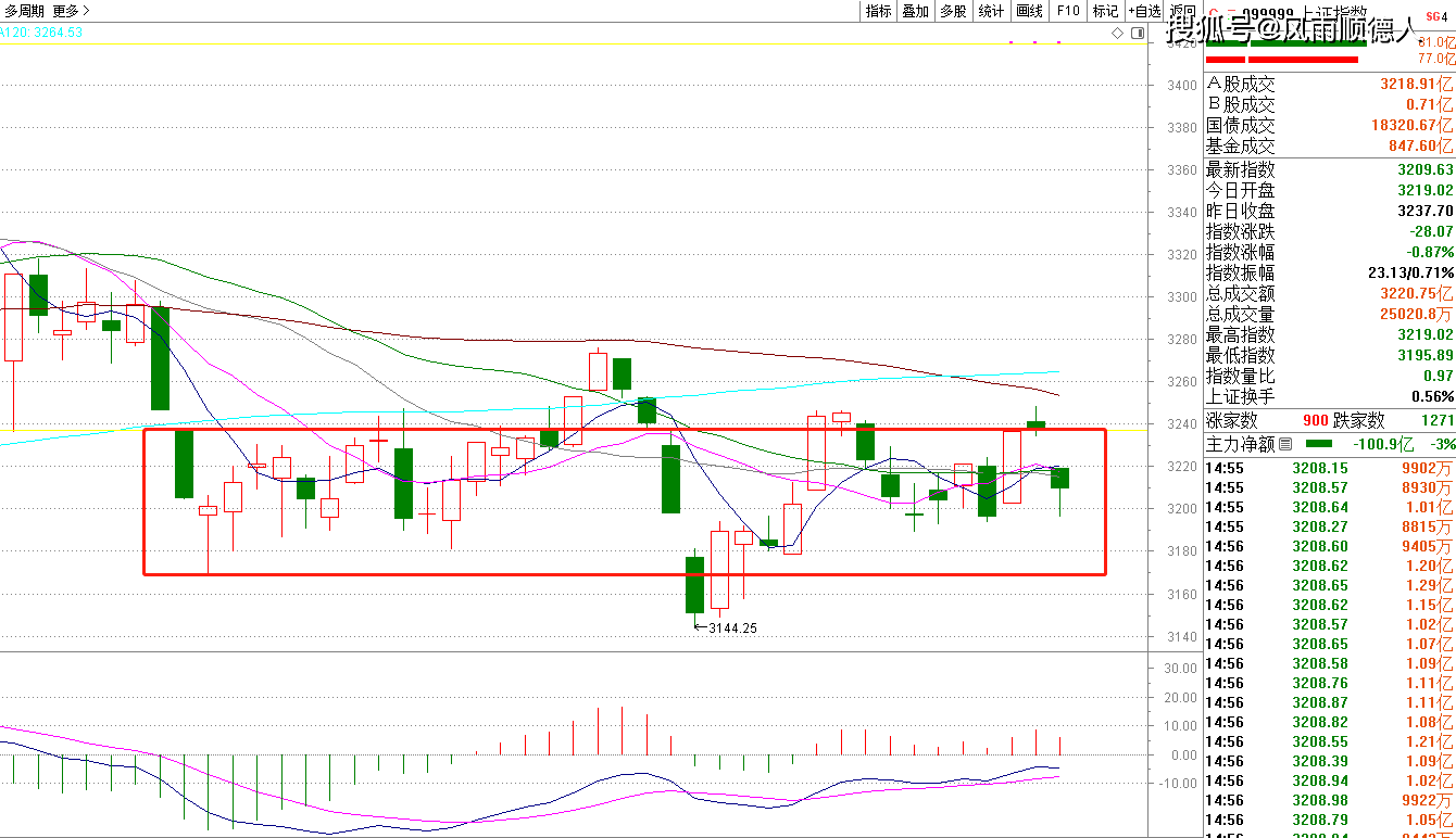 上证指数 今天低开探底后尾盘回升,实际上还是调整,我没有看均线粘合,原因是近期震荡行情均线没有任何辅助功能,反而红色箱体的更大一些,上周因为数据不理想,我认为很难出现突破,现在回落至箱体中部,还是调整周期,未到箱低前我还是谨慎一些,或者等待整体数据进入箱底阶段再谈吧。