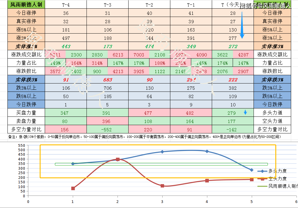 1、整体数据分析:跌3%个股382家,涨3%个股277家,实体涨停27家,当天跌停10家,做多力道279,做空力道177。