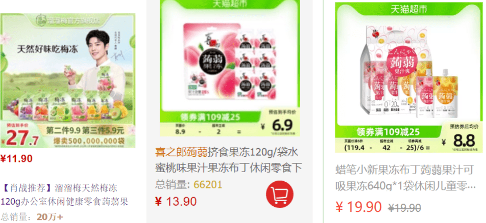 在淘宝平台内,同样是120g单品,梅冻产品折后售价11.9元,喜之郎蒟蒻果冻折后售价6.9元,而蜡笔小新蒟蒻果冻640g售价19.9元,折算120g仅要4元。