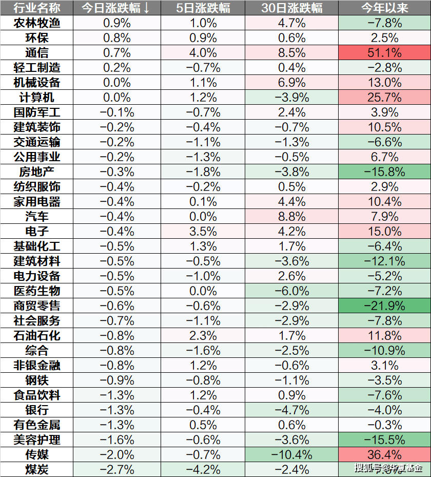 行业上来看,农林牧渔、环保、通信上涨,煤炭、传媒、美容护理下跌。