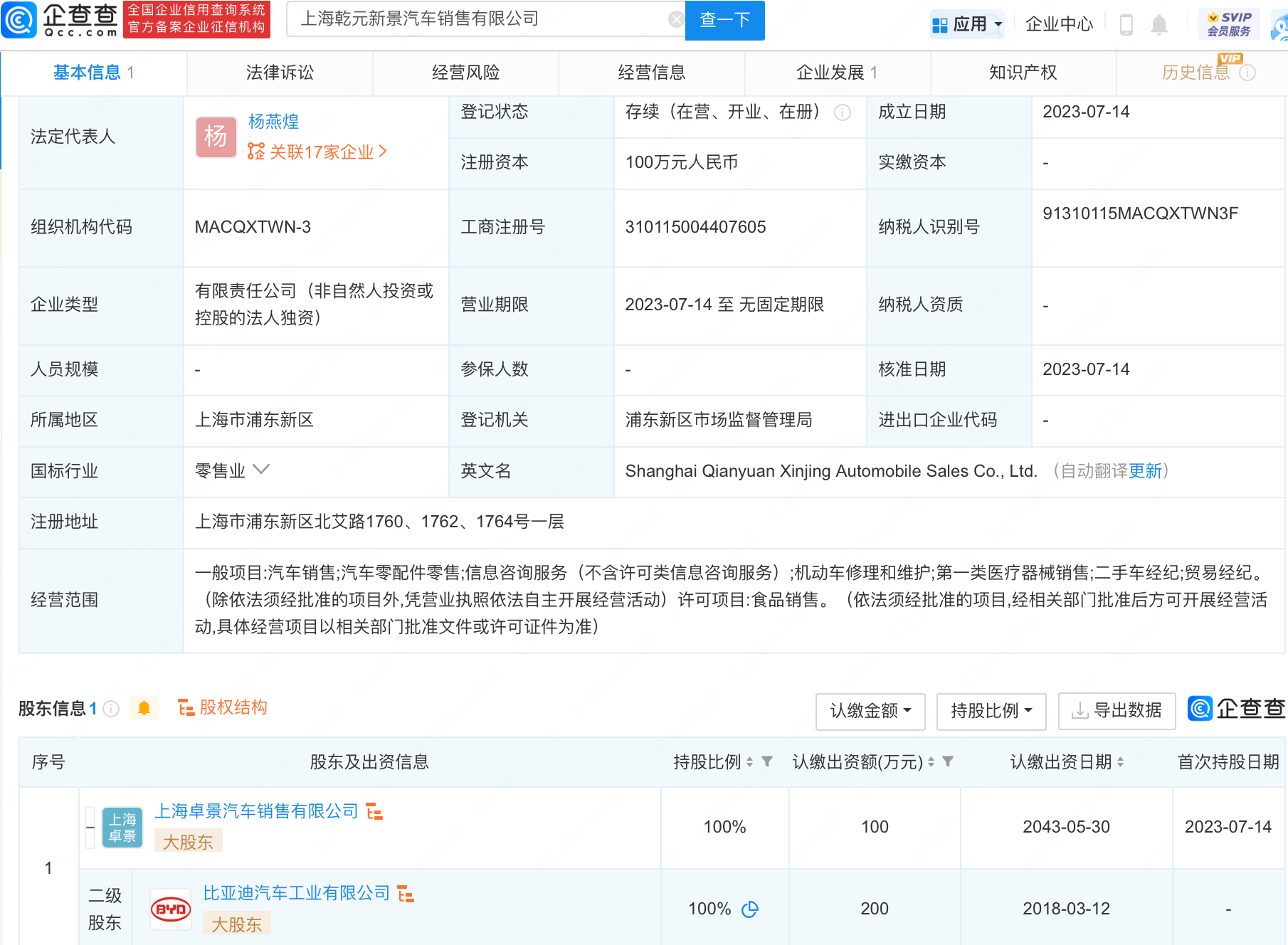 企查查APP显示,近日,上海乾元新景汽车销售有限公司成立,法定代表人为杨燕煌,注册资本100万元人民币,经营范围包含:汽车销售、汽车零配件零售、机动车修理和维护等。企查查股权穿透显示,该公司由比亚迪汽车工业有限公司间接全资持股。
