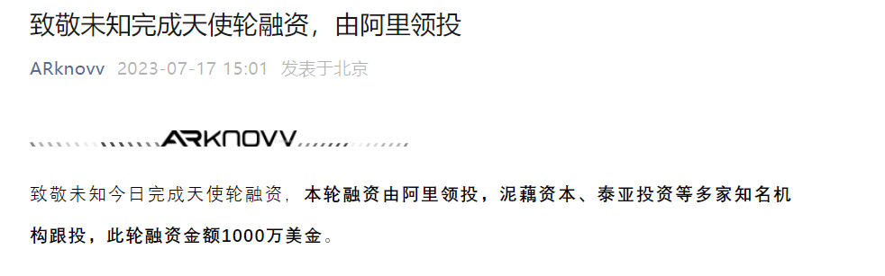 鞭牛士 7月17日消息,AR厂商致敬未知宣布完成天使轮融资,此轮融资金额1000万美金。本轮融资由阿里领投,泥藕资本、泰亚投资等多家知名机构跟投。