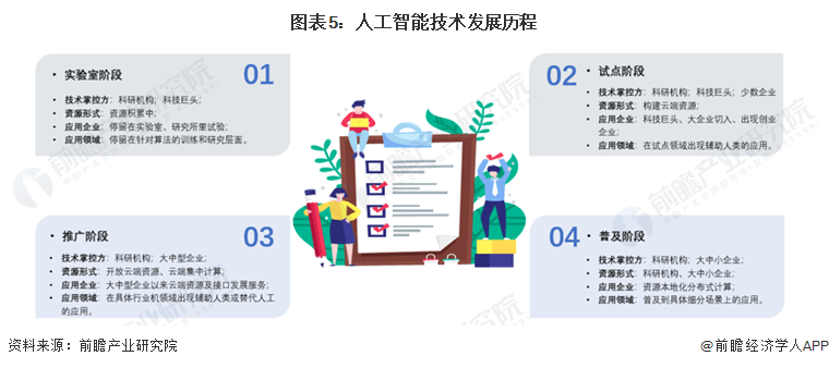 按照不同时期的技术成熟度、推广应用度不同,人工智能的每个阶段可以被分为实验室阶段、试点阶段、推广阶段和普及阶段。实验室阶段重点是针对算法的训练和研究;试点阶段的特征是大企业切入,出现试点应用;推广阶段意味着技术已经推广到大中型企业应用,云端资源集中计算;普及阶段则实现分布式计算,普及到个人在具体细分场景下的应用。目前,我国正处在感知智能的试点阶段,主要的试点领域包括:智能硬件、机器人、虚拟场景、安防、虚拟服务和商业智能。