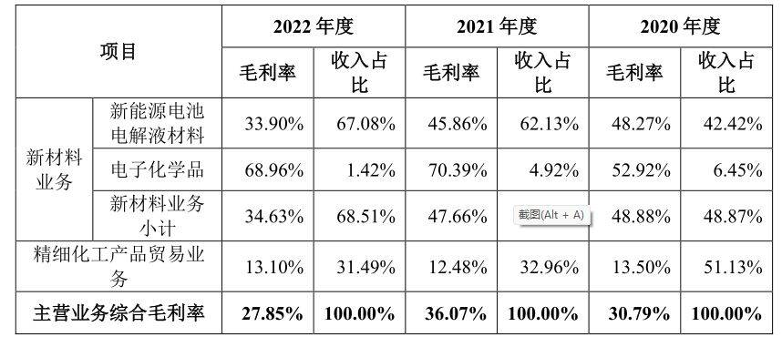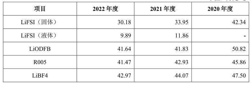 不容乐观的是,如鲲新材新材料业务主要产品价格在不断下滑。报告期内,如鲲新材新材料业务包括新能源电池电解液材料及电子化学品,报告期内主要产品为LiFSI、LiODFB、R005、LiBF4等。如LiFSI(固体)报告期内售价分别为42.34万元/吨、33.95万元/吨、30.18万元/吨,LiODFB售价分别为50.82万元/吨、41.83万元/吨、41.64万元/吨,所有主要产品销售价格均呈现下降趋势。