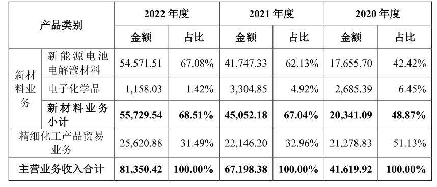 新能源电池产业作为当下的热门赛道,竞争愈发激烈。报告期内,如鲲新材主营业务分别为新材料业务和精细化工产品贸易业务,其中新材料业务为营收大头,营收占比分别为48.87%、67.04%、68.51%,占比越来越高。