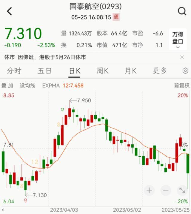 受另一起突发事件发酵影响,国泰航空股价下行。