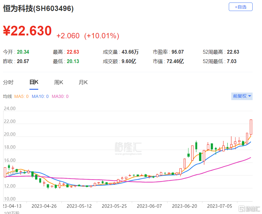 恒为科技:今日涨停,成交额9.60亿元,换手率13.64%,2机构净买入1.29亿元,1机构净卖出3095.61万元。