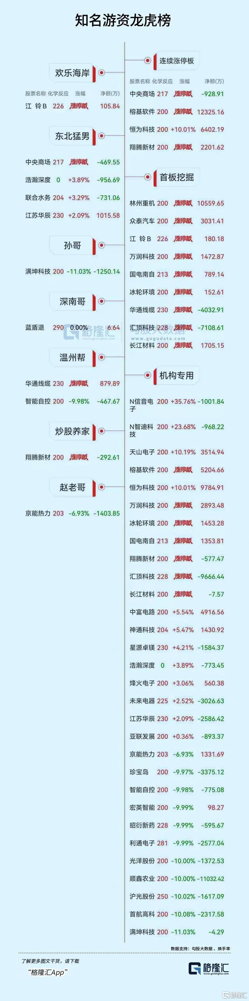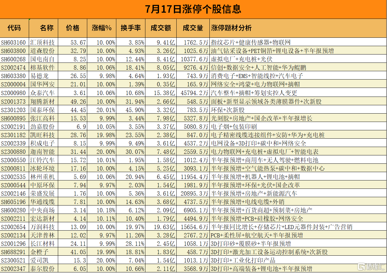 网络安全概念股国华网安9天6板、榕基软件2板,业绩超预期的林州重机14天8板、中央商场2板,汽车+实控人拟变更的众泰汽车11天6板,消费电子板块翔腾新材2板、万润科技3天2板,凯旺科技创业板首板,3D打印概念股爱司凯创业板首板、金橙子科创板首板,虚拟电厂概念股迦南智能创业板首板。