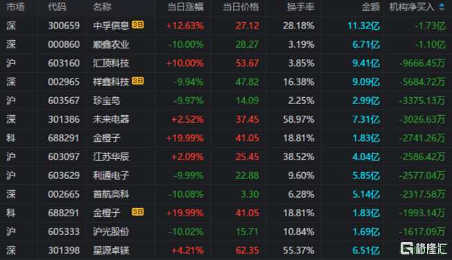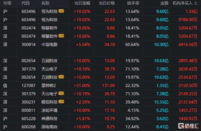 龙虎榜中涉及机构专用席位的个股中,当日净买入额前三为恒为科技、榕基软件、中富电路,分别为9784.90万元、5204.67万元、4916.56万元。