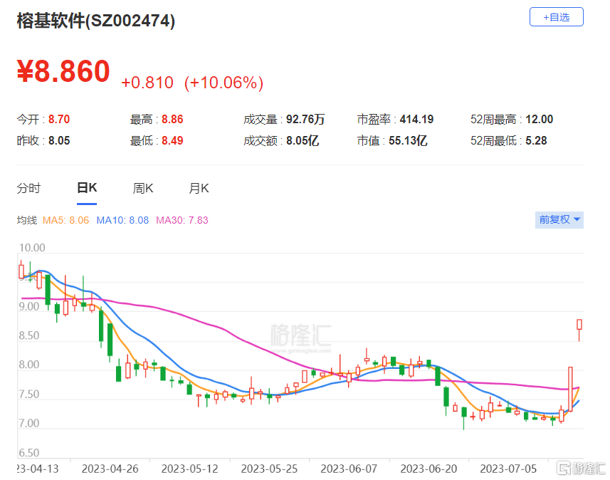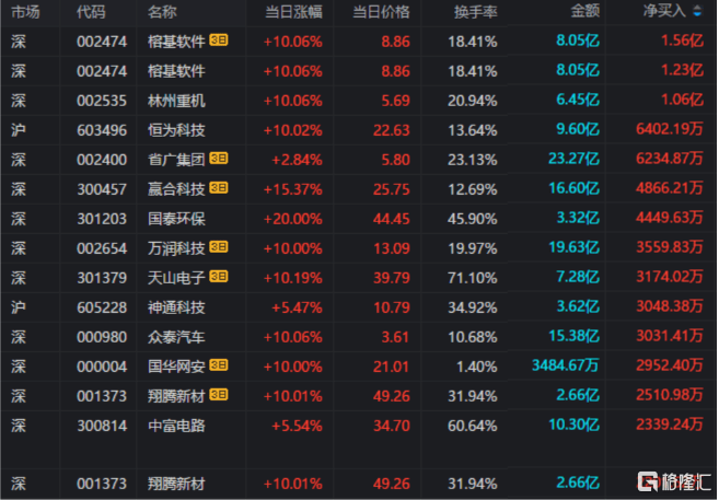 榕基软件:今日涨停,成交额8.05亿元,换手率18.41%,机构净买入5204.67万元,营业部席位合计净买入7120.50万元。