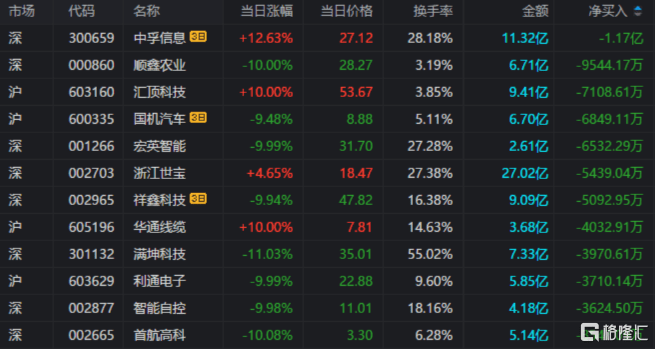 龙虎榜当日净卖出额前三为顺鑫农业、汇顶科技、宏英智能,分别为9544.17万元、7108.61万元、6532.29万元。