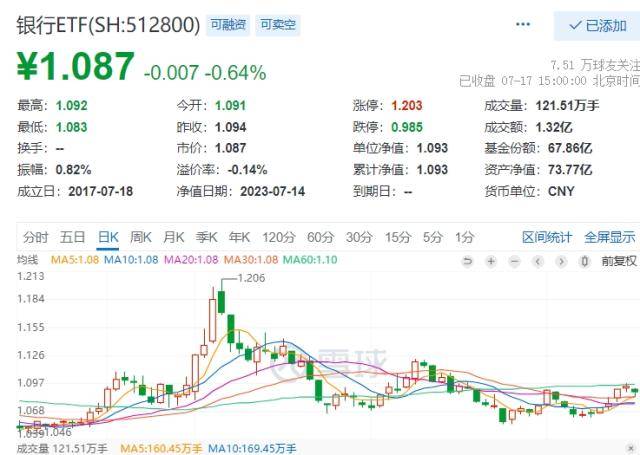体现在二级市场上,今日银行板块跳空低开,全天走势低迷,中证银行指数最高跌1.77%,收跌1.39%。板块代表ETF——银行ETF(512800)全天弱势震荡,场内价格收跌0.64%,表现优于指数,场内成交额1.32亿元,较前一日缩量33.67%。