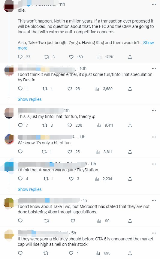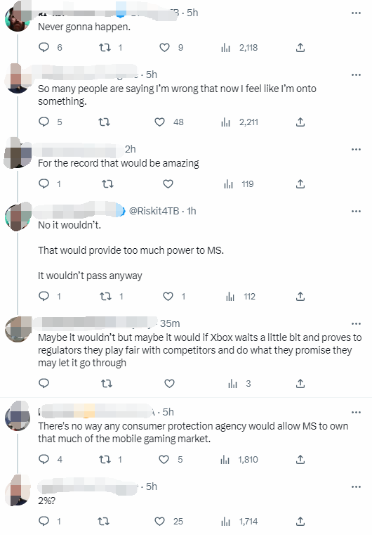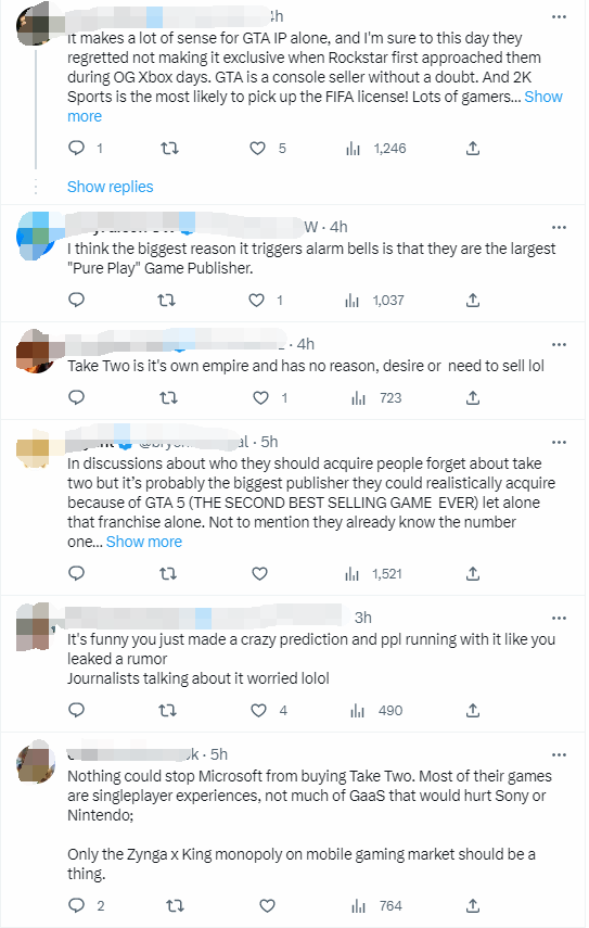 支持这一观点的玩家认为,微软此前曾考虑过收购Zynga,后者最终被T2纳入麾下,现在直接收购T2就可以一举多得,继续扩大主机和移动游戏市场的份额。另一方面,美国FTC和英国CMA在吃瘪后难以再对微软产生太大的威胁。