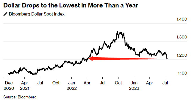 随着美国6月CPI和PPI大幅降温,美元指数上周累跌2.26%,创2022年11月以来最差周线,同时创下15个月新低。7月17日(周一)亚洲早盘,美元指数继续下探100下方。上周美元指数的大跌之际,美债收益率也连续走弱,进一步削弱了美元的吸引力,同时提振了日元和墨西哥比索等其他货币。许多策略师和机构表示,美元这一全球主要储备货币的强周期已经结束,而一旦这种强周期的结束,则将对全球经济和金融市场产生深远的影响。