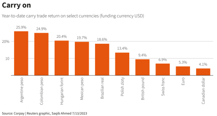 最后,美元的持续弱势还可能会提振美元套息交易(即买入高息货币,卖出低息货币)等外汇策略的利润。Corpay的数据显示,美元的贬值已经使融资套息交易策略在今年成为一个有利可图的策略。例如,卖出美元、买入阿根廷比索的投资者年初至今的收益率已经高达约26%,而卖出美元、买入哥伦比亚比索的收益率也高达近25%。