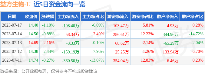 截至2023年7月17日收盘,益方生物(688382)报收于14.4元,下跌1.1%,换手率1.17%,成交量1.24万手,成交额1780.91万元。