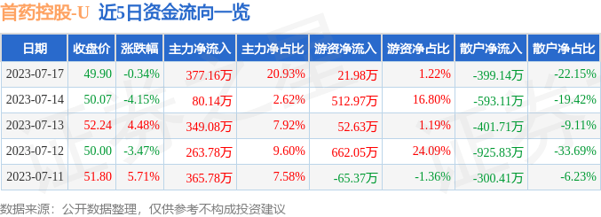截至2023年7月17日收盘,首药控股(688197)报收于49.9元,下跌0.34%,换手率0.71%,成交量3648.0手,成交额1801.71万元。