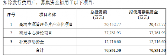 根据预案(修订稿),本次拟发行可转换公司债券募集资金总额不超过7.09亿元,投向“高端电源管理芯片产业化项目”“研发中心建设项目”和“补充流动资金”,金额分别2.05亿、3.78亿和1.27亿元。
