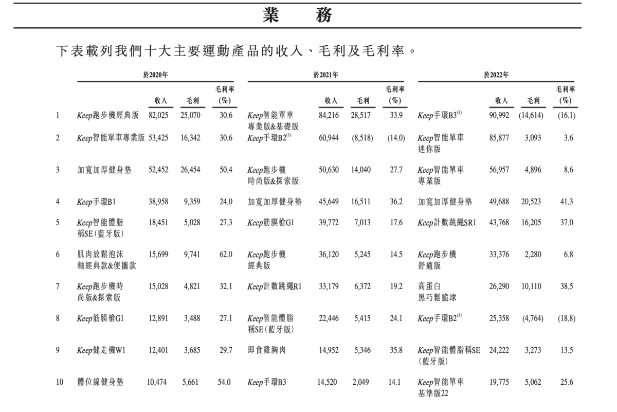 到了2022年,排名情况发生了变化,Keep手环B3、Keep智能单车MIni版以及Keep只能单车专业版位列前三,而对应的毛利率分别16.1%、3.6%以及8.6%。