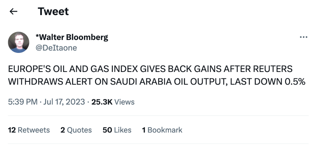 7月17日下午,一则“路透社报道:沙特能源部称将自愿减产措施延长至2024年底”的消息引爆原油市场,美油、布油均直线拉升超2%,欧股能源股纷纷跟涨。