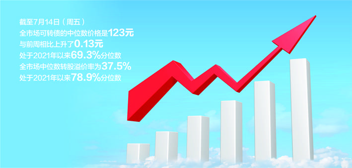 截至7月14日(周五),全市场可转债的中位数价格是123元,与前周相比上升了0.13元,处于2021年以来69.3%分位数;全市场中位数转股溢价率为37.5%,处于2021年以来78.9%分位数。