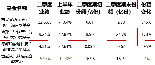 随着净值曲线的陡峭向上,东吴移动互联基金的规模也迅速增长,至二季度末其基金份额达到2.73亿份(A、C合并计算,下同),而其期初份额还仅有0.61亿份,二季度份额增幅高达345%。