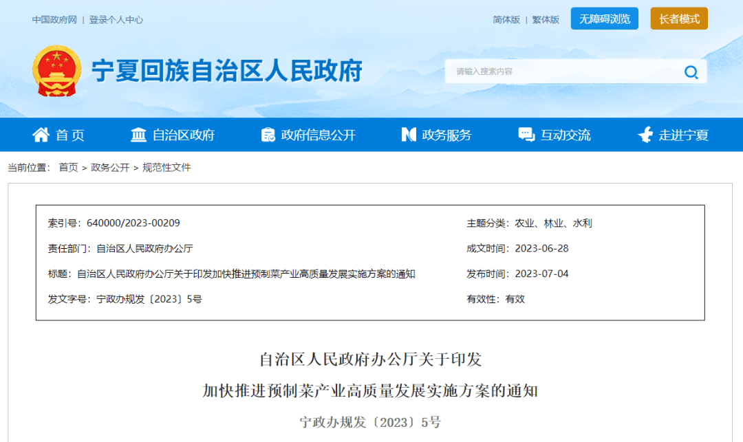 2023年7月4日,宁夏回族自治区人民政府办公厅印发《加快推进预制菜产业高质量发展实施方案》,提出要着力打造一批预制菜产业高地和产业集群,为加快建设乡村全面振兴样板区提供有力支撑。