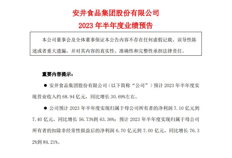 安井食品发布2023年半年度业绩预告,预计公司2023年半年度实现营业收入约68.94亿元,较上年同期增加16.19亿元,同比增长30.69%左右。