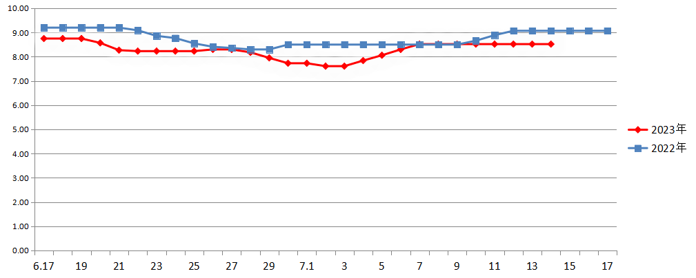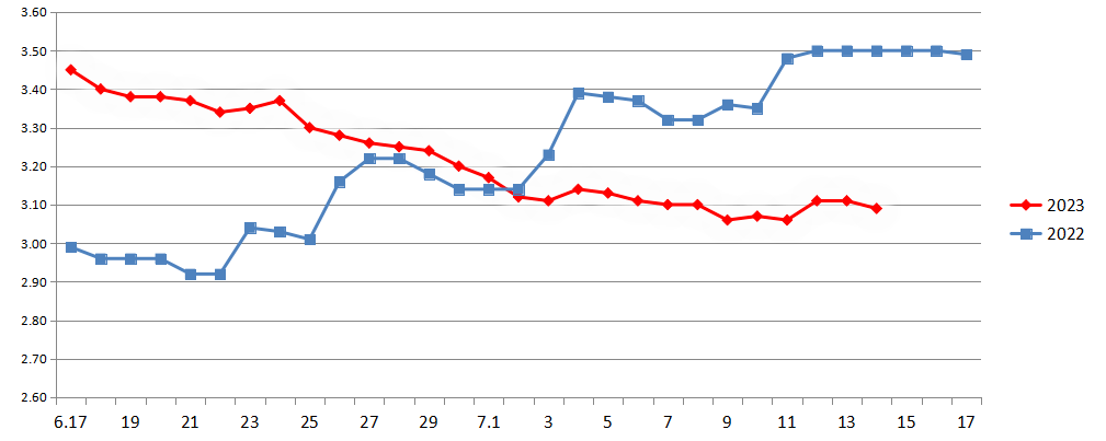 2023年6月末7月初与2022年同期白条猪平均价走势对比图