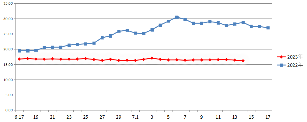2023年6月末7月初与2022年同期鸡蛋平均价走势对比图