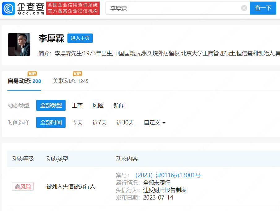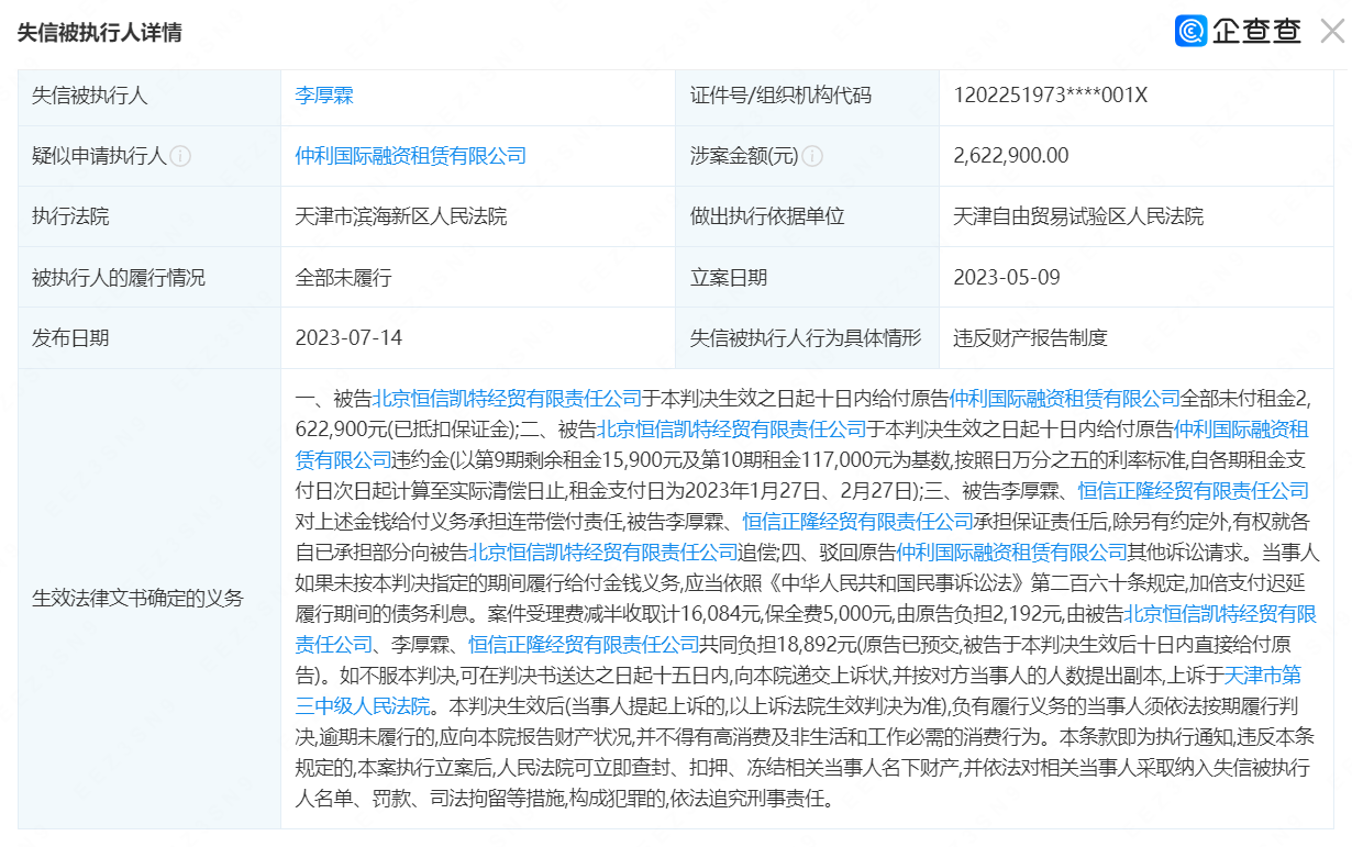新京报贝壳财经讯 企查查APP显示,近日,因被执行人履行情况全部未履行,I Do钻戒创始人李厚霖被天津市滨海新区人民法院列为失信被执行人(老赖)。相关案件文书显示,被告北京恒信凯特经贸有限责任公司应给付原告仲利国际融资租赁有限公司全部未付租金262万余元(已抵扣保证金)及违约金;被告李厚霖、恒信正隆经贸有限责任公司承担连带偿付责任,承担连带偿付责任后有权向被告北京恒信凯特经贸有限责任公司追偿。