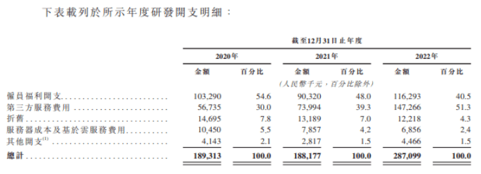 报告期内,雇员福利开支分别为1.03亿、9032.0万、1.16亿,占同期研发费用比例分别为54.6%、48.0%、40.5%;第三方服务费用分别为5673.5万、7399.4万、1.47亿,占比分别为30.0%、39.3%、51.3%。
