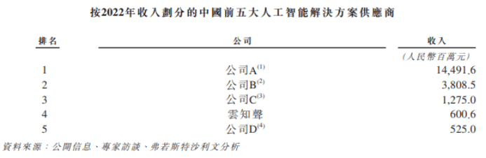 本次云知声拟于港交所上市,最新的招股书披露,作为一家人工智能企业,云知声在2022年收入划分的中国前五大人工智能解决方案供应商中排名第四,收入为排名第一的公司A的4.14%,排名第二的公司B的15.77%,排名第三公司C的47.11%。显然,收入远低于前三家公司。