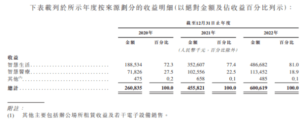 报告期内,云知声智慧生活实现营收1.89亿、3.53亿、4.87亿,占比分别为72.3%、77.4%、81.0%;智慧医疗实现营收分别为7182.6万、1.03亿、1.13亿,占比分别为27.5%、22.5%、18.9%。