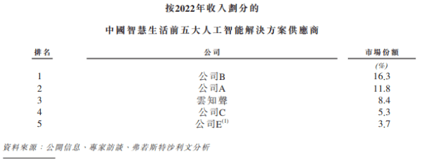 根据弗若斯特沙利文的数据,以2022年的收入而言,云知声于中国智慧生活市场人工智能解决方案供应商中排名第三,市占额为8.4%,与第一和第二名差距颇大。