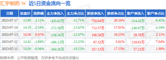 截至2023年7月17日收盘,汇宇制药(688553)报收于13.89元,下跌2.11%,换手率0.93%,成交量2.68万手,成交额3719.76万元。