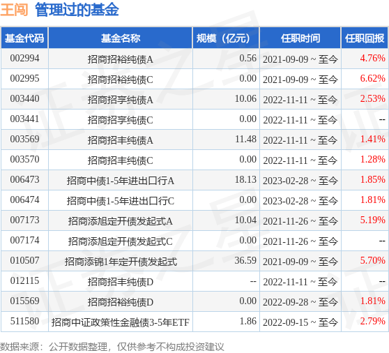 王闯先生:中国,研究生、硕士。曾任职于德勤华永会计师事务所、平安保险,先后从事审计、债券市场核算、交易及投资研究工作。2014年12月加入招商基金管理有限公司,曾任基金会计、交易员,2018年6月加入固定收益投资部,曾任研究员、投资经理。2021年9月9日担任招商招裕纯债债券型证券投资基金基金经理、招商添锦1年定期开放债券型发起式证券投资基金基金经理。2021年11月26日起担任招商添旭3个月定期开放债券型发起式证券投资基金基金经理。2022年11月11日任招商招丰纯债债券型证券投资基金的基金经理。2023年2月28日起任招商中债1-5年进出口行债券指数证券投资基金基金经理。