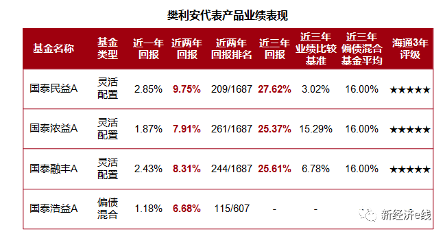 Wind统计显示,包括国泰民益、国泰浓益、国泰融丰、国泰浩益在内,樊利安目前在管的多只混合型基金,均以股债2/8稳健收益策略为主,中长期业绩走势稳健向上,业绩排名靠前。基金近2年业绩普遍排名同类前20%,近三年收益率均在25%左右,且显著超越业绩比较基准和偏债混合基金平均水平。