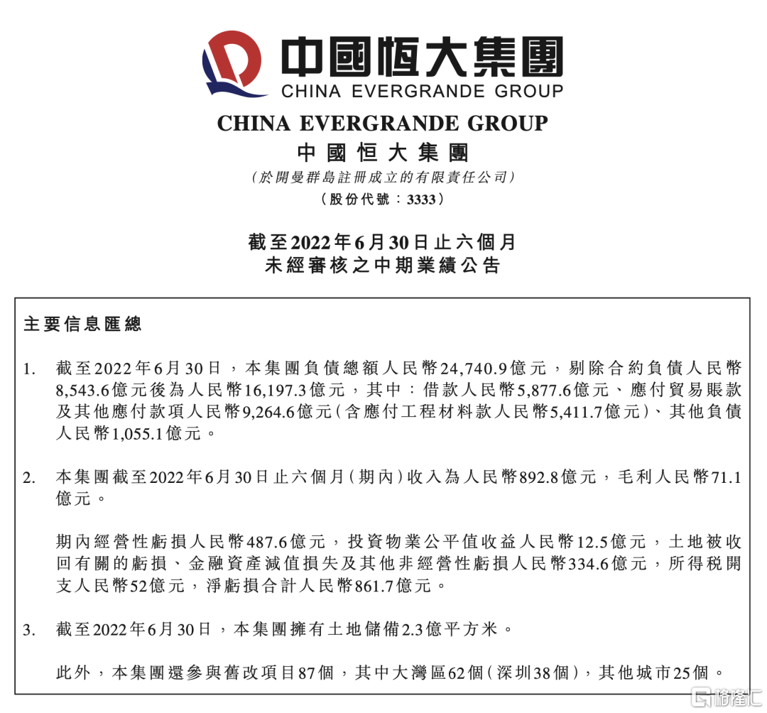 2022年中报则显示,截至2022年6月30日,恒大集团负债总额人民币24740.9亿元,剔除合约负债人民币8543.6亿元后为人民币16197.3亿元,其中:借款人民币5877.6亿元、应付贸易账款及其他应付款项人民币9264.6亿元(含应付工程材料款人民币5411.7亿元)、其他负债人民币1055.1亿元。
